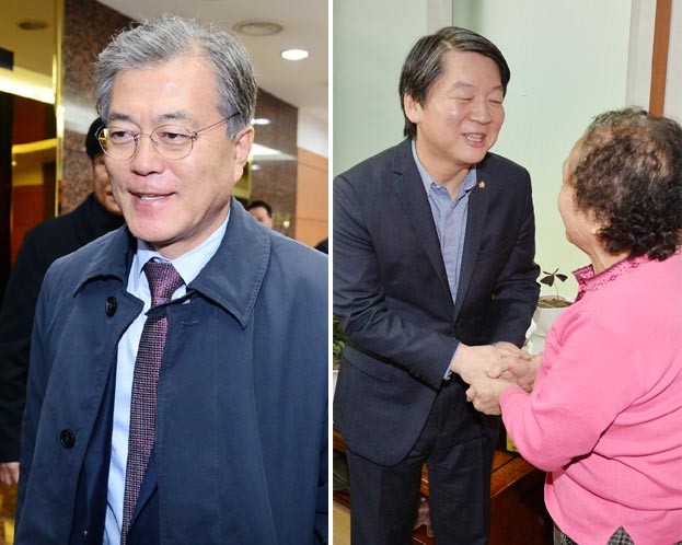 새정치민주연합 문재인 대표가 선거구 획정일을 하루 앞둔 14일 오전 부산 김해국제공항을 도착해 차량으로 이동하고 있다. 문 대표는 이 날부터 이틀 간 당무를 쉬고 부산에서 당과 정국운영 방안을 구상할 예정이다(왼쪽). 새정치민주연합 탈당을 선언한 안철수 전 공동대표는 14일 오전 '효사랑 나눔축제'가 열린 서울 노원구의 한 아파트 경로당을 첫 공식일정으로 방문, 어르신들을 만나 인사를 하고 있다.