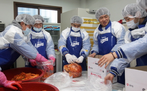 삼성 라이온즈는 15일 오전 대구적십자사, 대구아동복지센터와 성가양로원, 고성동 주민센터에서 김장 나눔 봉사활동을 진행한다. 선수 50여명과 코칭스태프 17명이 한데 모여 김장김치를 담근 뒤 사회단체와 주민센터에 직접 전달하는 방식이다.