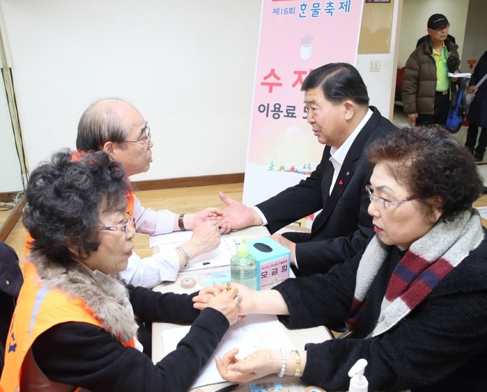 조길형 영등포구청장은 지난 14일 영등포노인종합복지관에서 개최된 노인 평생교육프로그램 '한물축제'에 참석해 프로그램을 통해 교육을 받은 노인에게 수지침을 맞고 있다.(사진제공=영등포구청)