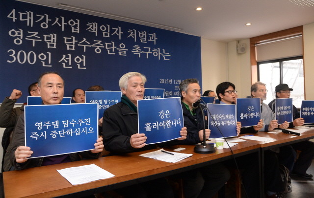 환경시민단체 관계자들이 15일 오후 서울 중구 정동 프랑치스코 횐관에서 열린 4대강사업 책임자 처벌과 영주댐 담수중단 촉구를 위한 300인 선언에서 구호를 외치고 있다.