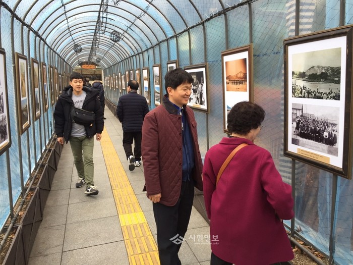 서울 노원구가 동절기 구청 청사내에 조성된 넝쿨터널을 조명 장식으로 꾸미고 작품 전시를 진행하고 있는 가운데 지난 15일 청사를 방문한 주민들이 노원의 과거와 현재의 모습이 담진 사진 작품들을 감상하고 있다.(사진제공=노원구청)