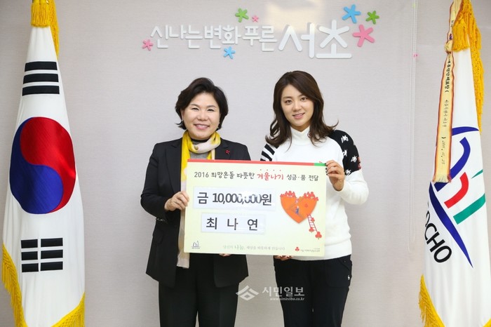 프로골퍼 최나연 선수(SK텔레콤)가 서초구에서 실시하는 '따뜻한 겨울나기 캠페인'에 1000만원을 기부했다. 사진은 전달식에 참석한 조은희 구청장과 최 선수가 기념촬영을 하는 모습.(사진제공=서초구청)