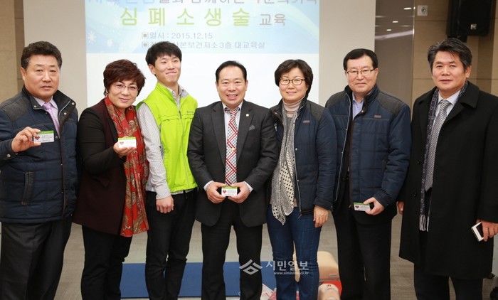 경기 군포시의회 의원들은 지난 15일 군포시 산본보건지소에서 응급상황 발생시 생명을 구할 수 있는 심폐소생술 교육을 받았다. 사진은 교육에 참석한 의원들이 기념촬영을 하는 모습.(사진제공=군포시의회)