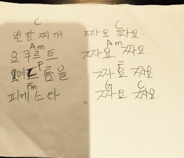 공개된 사진은 차오루가 한국어로 적은 재미있는 가사를 볼 수 있다. '된장찌개 짜요짜요,요구르트 짜요짜요'라는 내용의 기발한 발상이 돋보인다.