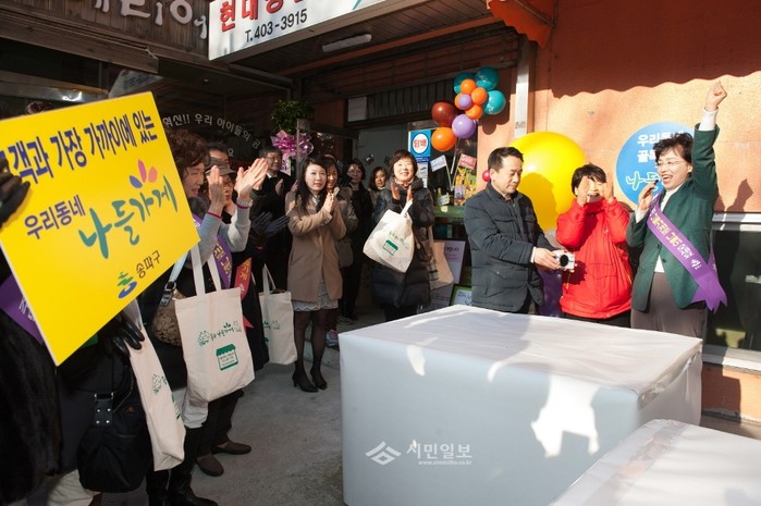 송파구는 지난 16일 가락동에서 '나들가게 모델샵' 개점식을 진행했다. 사진은 행사에 참석한 박춘희 구청장(오른쪽)이 주민들에게 인사말을 하는 모습.(사진제공=송파구청)