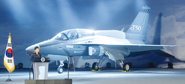 박근혜 대통령이 17일 오전 경남 사천 한국항공우주산업(KAI) 본사에서 열린 미국 수출형 훈련기(T-X) 공개 기념식에 참석, 축사를 하고 있다.