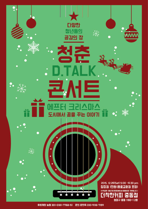 크리스마스의 따뜻한 마음을 모아 음악과 함께 꿈을 이야기할 청춘 D.talks 콘서트는 이달 26일 더착한커피 중동점에서 진행되며, 더착한커피 중동점은 공간기부에 동참하는 한편, 지역 주민에게 좋은 커피와 삶의 가치를 나누는 공간으로 다가간다.