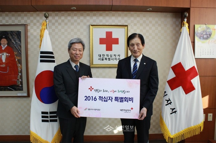 서울 성동구도시관리공단은 임직원이 모은 175만5000원을 소외이웃을 위해 대한적십자사 서울지사에 특별회비로 기증했다. 사진은 기증식에 참석한 제타룡 적십자사 서울지사 회장과(오른쪽)과 김종수 공단 이사장의 모습.(사진제공=성동구도시관리공단)