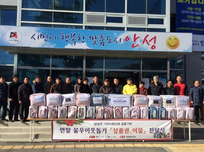 경기 안성시 양성면은 지난 17일 면사무소에서 ‘2015 연말 불우이웃돕기 물품 전달식’을 진행했다. 사진은 물품을 전달한 지역내 기관사회단체 관계자들이 기념촬영을 하는 모습.(사진제공=안성시청)