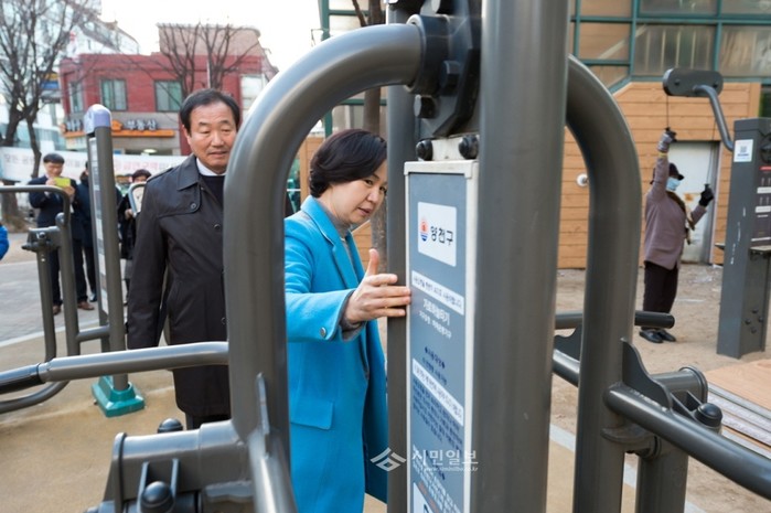 김수영 서울 양천구청장이 최근 신월2동을 찾아 '현장 구청장실'을 운영한 가운데 지역내 운동기구 설치 장소를 찾아 안전 여부를 확인하고 있다.(사진제공=양천구청)