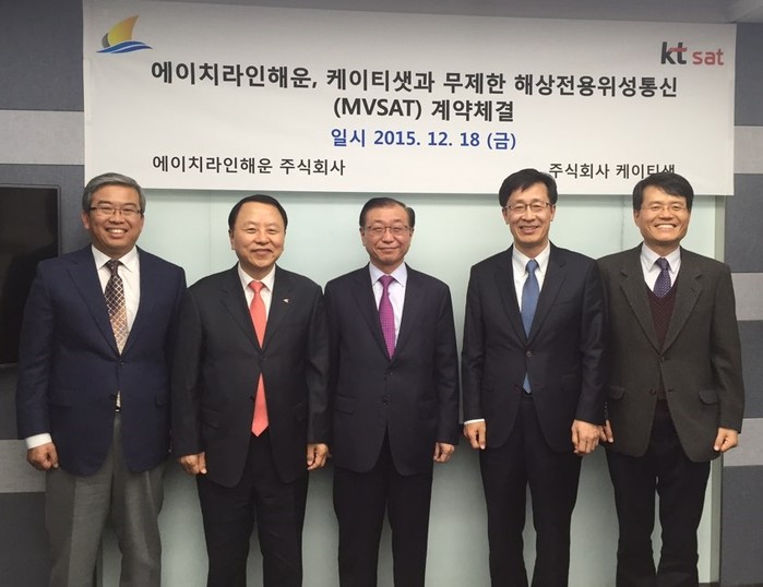 KT SAT(대표 송재국)이 18일(금) 서울시 종로구 에이치라인해운 본사에서 에이치라인해운(대표 이영준)과 해상전용위성통신(MVSAT) 공급계약을 체결했다고 밝혔다. 양 사 관계자(좌측부터 에이치라인해운 변수근 전무, 이영준 대표이사, KT SAT 송재국 대표이사, 장기승 부사장, 양상진 위성서비스본부장)들이 계약 체결 후 기념 촬영을 하고 있다.
