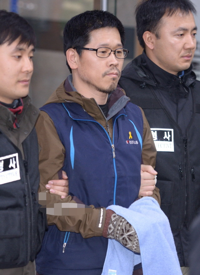 18일 오전 서울 남대문 경찰서에서 한상균 민주노총 위원장이 검찰로 송치되고 있다.