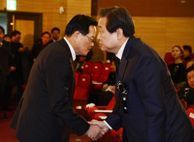 故 이만섭 前 국회의장 국회장 영결식이 18일 오전 서울 여의도 국회 의원회관 대강당에서 열린 가운데 정의화 국회의장과 새누리당 김무성 대표가 굳은 표정으로 악수를 나누고 있다.