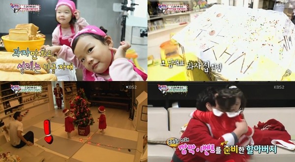 과자 집을 완성한 아이들은 아빠 동국과 크리스마스 트리까지 만들고 크리스마스를 만끽한다. 이 가운데 현관에서 산타가 등장하고 아이들은 어리둥절하면서도 선물을 달라고 말해 시청자들의 웃음을 자아냈다.