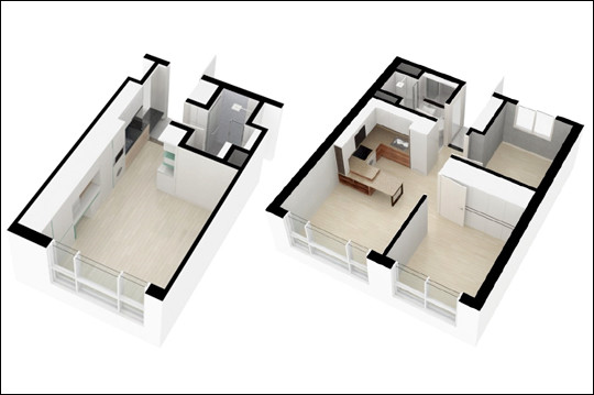 A, B타입은 원룸형이며, C타입은 고급스러운 글라스 도어로 공간 분리가 가능한 가변형 공간 구조로 원룸, 또는 투룸으로 보다 다양하게 공간을 활용할 수 있다. 그리고 D타입은 방 2개와 거실, 부엌으로 구분되어 일반 오피스텔과는 차별화된 구조로 아파트와 같은 라이프 스타일을 연출한다.