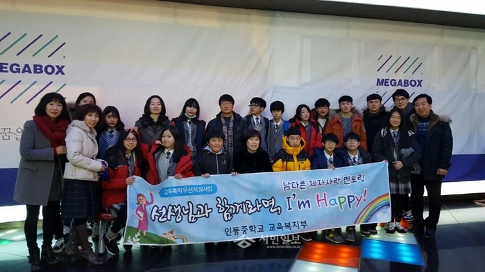 경북 구미시 인동중학교는 최근 메가박스 영화관에서 '선생님과 함께라면 I'm Happy' 프로그램을 실시했다. 사진은 행사에 참석한 관계자들이 기념촬영을 하는 모습.(사진제공=구미교육지원청)