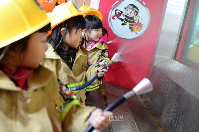 서울 영등포소방서는 지난 21일 오전 소방서 4층 소방안전체험관에서 청은유치원 보육교사와 어린이들을 대상으로 소방안전체험교육을 실시했다. 사진은 교육에 참석한 어린이들이 소화기 사용 실습을 하는 모습.(사진제공=영등포소방서)