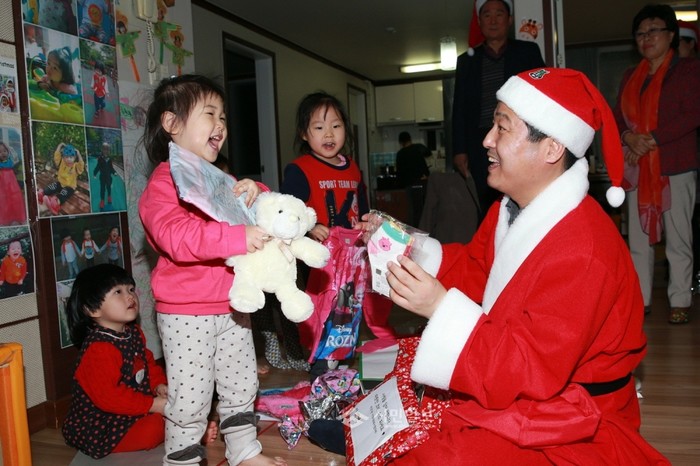 김영배 성북구청장이 22일 깜짝 산타로 변신, 성북구 직장어린이집 등을 방문해 원생들에게 선물을 전달하고 있다. 김 구청장은 이 자리에서 시설 관계자들을 만나 아동친화도시 정착에 대한 의견을 경청했다.(사진제공=서대문구청)