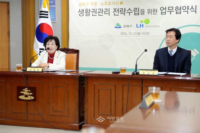 송파구는 지난 21일 구청 기획상황실에서 한국토지주택공사(LH)와 ‘생활권관리 전략수립 업무협약식’을 진행했다. 사진은 협약식에 참석한 박춘희 구청장이 현도관 LH서울지역본부장과 대화를 나누는 모습.(사진제공=송파구청)