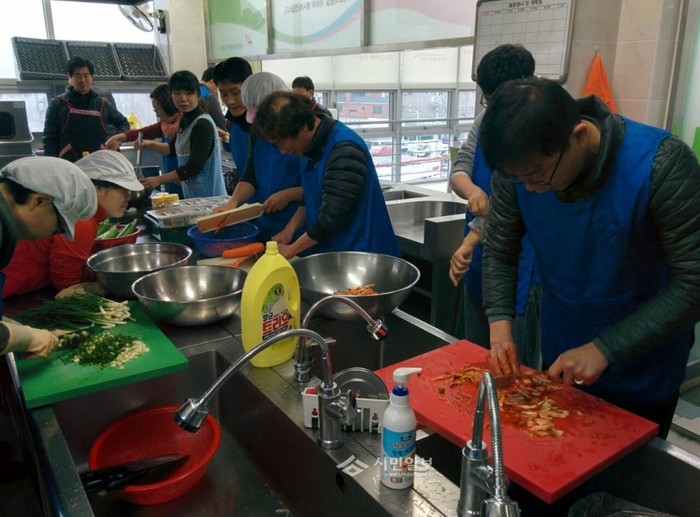 경기 여주시 기획예산담당관실 직원들은 지난 19일 장애인복지관에서 무료 배식봉사를 실시했다. 사진은 봉사에 참석한 관계자들이 음식을 만들고 있는 모습.(사진제공=여주시청)
