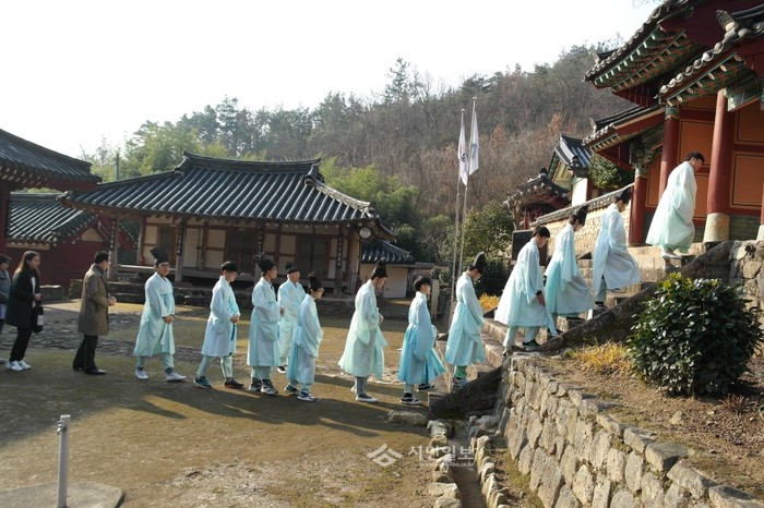 전남 장흥문화원은 지난 19일 장흥향교에서 지역내 청소년을 대상으로 ‘훈장님과 함께하는 장흥문화체험’을 실시했다. 사진은 교육에 참석한 청소년들이 의복을 갖추고 예절 교육을 받으러 걸어가는 모습.(사진제공=장흥군청)