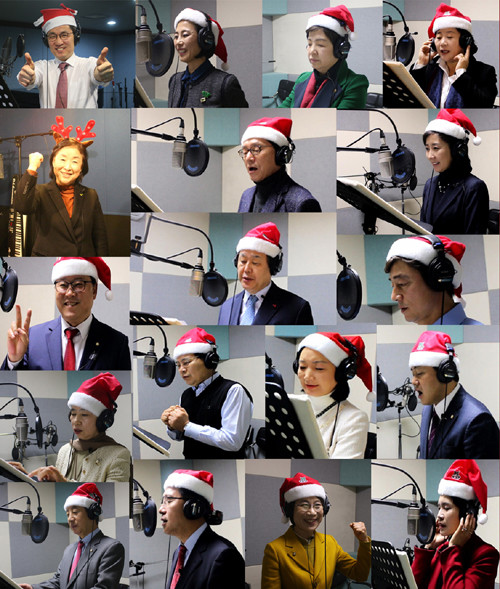 여야 국회의원들과 청년소셜기업 크리노베이션링크, 재능기부단체 한국대학생재능포럼, 청년음악가들이 크리스마스 캐럴 기부앨범 '블레싱(Blessing)'을 제작, 22일 오후 국회의원회관에서 발매식을 개최한다. 첫째줄 왼쪽부터 새누리당 김상민, 신의진, 윤명희 의원, 새정치민주연합 서영교 의원. 둘째줄 왼쪽부터 정의당 심상정 대표, 새누리당 이운룡, 나경원 의원. 셋째줄 왼쪽부터 새누리당 조원진, 김무성 대표, 새정치민주연합 송호창 의원. 넷째줄 왼쪽부터 새정치민주연합 전정희, 새누리당 홍문종, 문정림, 새정치민주연합 김관영 의원. 다섯째줄 왼쪽부터 새누리당 김성태, 전하진, 정의당 김제남, 새정치민주연합 한정애 의원.