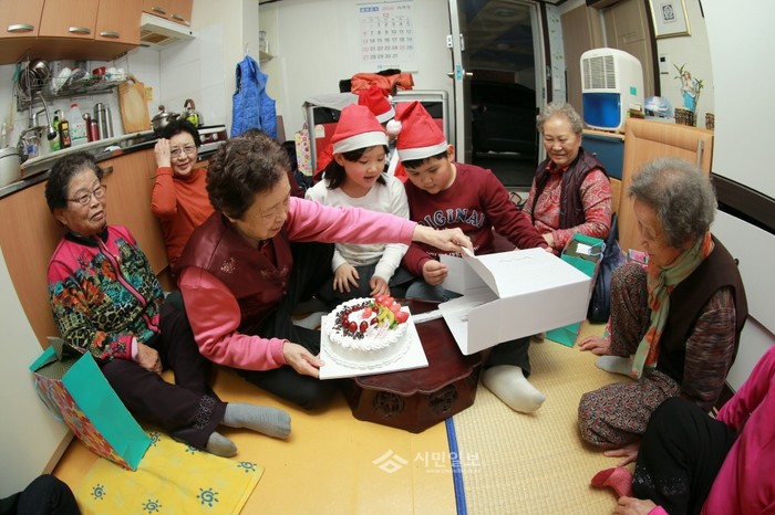 서울 서초구 드림스타트는 지난 22일 지역내 홀몸노인들이 있는 '친구모임방'을 방문했다. 모임방을 방문한 드림스타트 어린이들이 노인들에게 케이크를 전달하는 모습.(사진제공=서초구청)