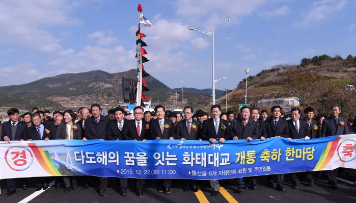 지난 22일 전남 여수시 화태대교 신기방면에서 주철현 시장, 박정채 시의회의장, 김성곤·주승용 국회의원, 박수관 YC-TEC 대표이사, 지역주민 등 500여명이 참석한 가운데 화태대교 개통 축하행사가 열리고 있다. /뉴시스