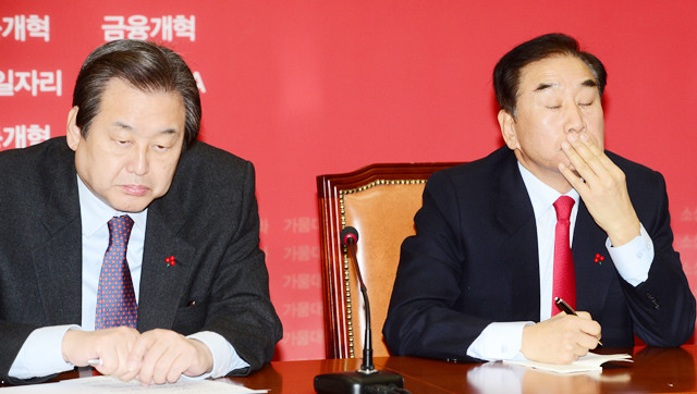 23일 오전 서울 여의도 국회에서 열린 새누리당 최고중진연석회의에서 김무성 대표와 이재오 의원이 심각한 표정을 하고 있다.