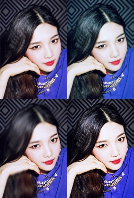 공개된 사진 속 조이는 하얀얼굴에 빨간 립스틱을 바른 채, 까망, 초록 컬러의 다양한 헤어컬러를 하고 있다.