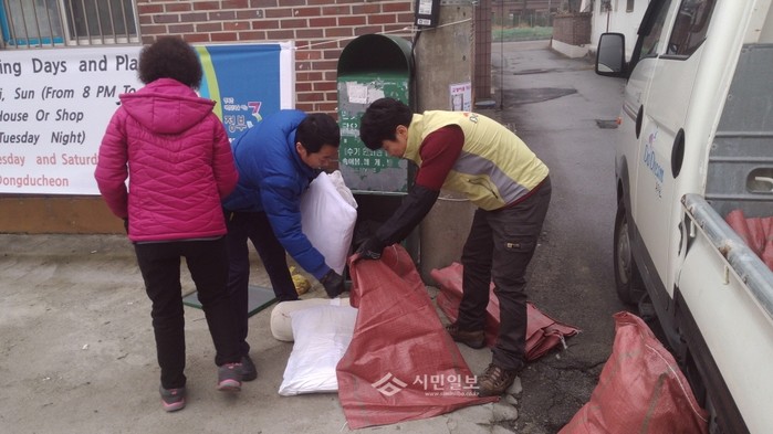 경기 동두천시 보산동 새마을 남녀지도자협의회는 최근 보산동 지역내에 설치된 헌옷수거함을 순회하며 그동안 쌓인 헌옷 등을 수거했다. 사진은 봉사활동에 참석한 관계자들이 헌옷을 수거하는 모습.(사진제공=동두천시청)