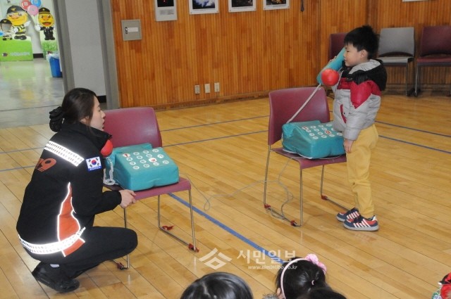 서울 서대문소방서는 최근 소방서에서 청목어린이집 어린이를 대상으로 어린이안전교육을 실시했다. 사진은 교육에 참석한 어린이가 119 신고요령에 대해 배우는 모습.(사진제공=서대문소방서)