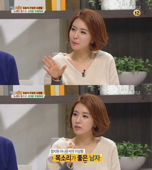 이날 정지원 아나운서는 노래로 상대를 유혹하는 동물들을 보고 "나는 목소리가 좋은 남자가 이상형이다"며 "가수 김동률을 좋아한다"고 말했다.