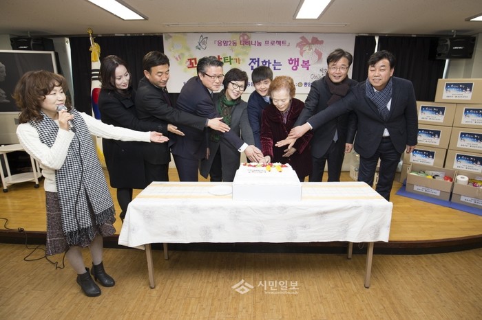 서울 은평구 응암2동 복지두레는 최근 응암2동 주민센터에서 충암초등학교 학생들과 함께 홀몸노인들에게 기부물품을 전달했다. 사진은 행사에 참석한 김우영 구청장(오른쪽에서 두 번째)과 관계자들이 케이크를 자르는 모습.(사진제공=은평구청)