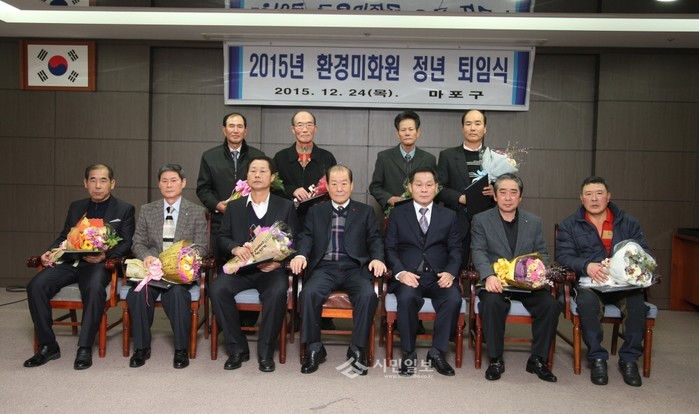 마포구는 최근 구청 중회의실에서 '2015년 환경미화원 정년퇴임식'을 진행했다. 사진은 행사에 참석한 박홍섭 구청장(앞줄 가운데)과 9명의 퇴임직원들이 기념촬영을 하는 모습.(사진제공=마포구청)