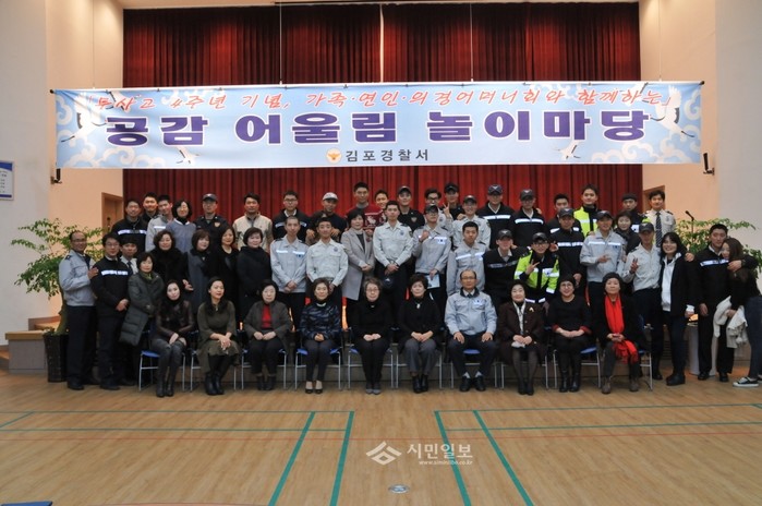 경기 김포경찰서는 최근 경찰서 112타격대원 및 의무경찰 부모 등이 참석한 가운데 의무경찰 ‘무사고 4주년’ 한마음 어울림 행사를 개최했다. 사진은 행사에 참석한 관계자들이 기념촬영을 하는 모습.(사진제공=김포경찰서)
