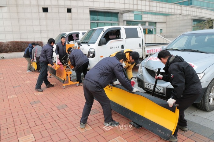 경기 양주시시설관리공단은 최근 문화예술회관에서 공단 임직원과 함께 '폭설대비 제설훈련'을 실시했다. 사진은 훈련에 참석한 관계자들이 차에 제설기를 부착하는 모습.(사진제공=양주시청)
