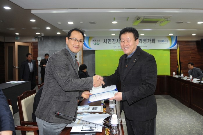경기 오산시는 최근 시청 상황실에서 '오산시 시민감사관 운영성과 평가회'를 개최했다. 사진은 행사에 참석한 유영봉 부시장(오른쪽)과 시민감사관이 악수를 하는 모습.(사진제공=오산시청)