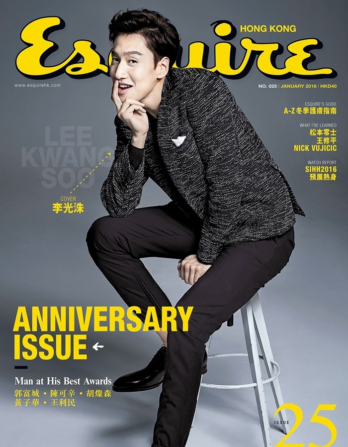 남성지 에스콰이어 홍콩판(Esquire HK) 2016년 1월호에서 공개된 커버 속 이광수는 모던하고 세련된 느낌을 자아낸다. 그는 테일러드 자켓와 블랙 팬츠를 군더더기 없는 깔끔한 핏으로 소화해냈다. 이광수는 큰 키와 완벽한 비율로 ‘모델포스’를 드러내면서도, 카메라를 향해 특유의 밝고 환한 미소로 국내외 팬들을 설레게 한다.