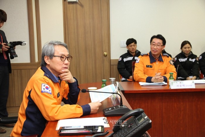 최근 이근면 인사혁신처장이 동작소방서를 방문해 소방대원들을 격려했다. 사진은 이 처장(왼쪽)과 서순탁 서장이 소방서 당면업무, 개선사항 등에 대해 토론하는 모습.(사진제공=동작소방서)