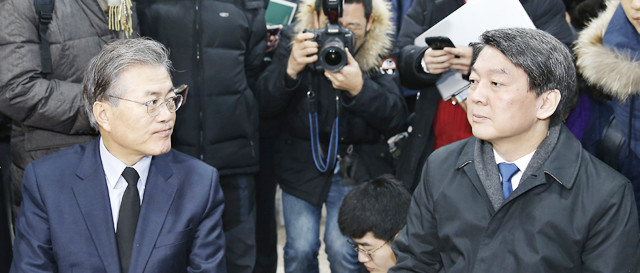 문재인 더불어민주당 대표와 안철수 무소속 의원이 지난 12월30일 오전 서울 도봉구 창동성당에서 열린 고 김근태 전 상임고문의 4주기 추모행사에서 만나 대화를 하고 있다.