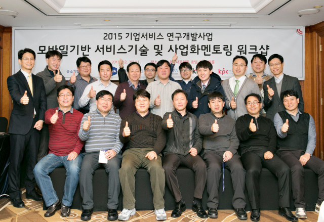 '2015년 기업서비스 연구개발사업' 멘토링 대상기업으로 선정된 스타트업 관계자들이 30일 서울 밀레니엄 힐튼호텔에서 진행된 '모바일기반 서비스기술 및 사업화멘토링 워크샵'에 참석해 기념촬영을 하고 있다.