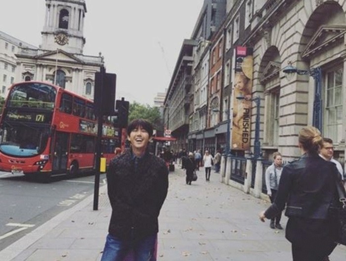 광희는 유럽풍 건축물과 이층버스 옆에 서서 활짝 웃으며 카메라를 바라보고 있다.