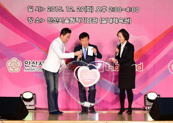 최근 경기 (사)안산시돌보미연대가 주최하고 안산시, 안산시의회 등이 함께하는 ‘나눔으로 소통하는 아름다운 세상! 2015 희망나눔 모금방송’이 올림픽기념관(실내체육관)에서 진행됐다. 사진은 제종길 시장이 모금함에 기부하는 모습.(사진제공=안산시청)