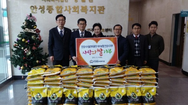 경기 안성시시설관리공단과 NH농협안성시지부는 최근 사랑의 쌀 80포를 지역내 어려운 이웃에게 써달라며 안성종합사회복지관에 전달했다. 사진은 전달식에서 관계자들이 기념촬영을 하는 모습.(사진제공=안성시청)