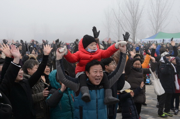 세종시가 지난 1일 시민과 각계 인사 등 7000여명이 참석한 가운데 호수공원에서 새해맞이 행사를 진행했다. 사진은 이날 행사에 참석한 시민들이 해맞이를 하는 모습.(사진제공=세종시청)