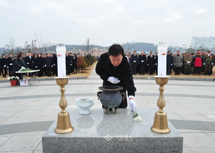 제종길 경기 안산시장은 지난 1일 오전 10시 단원구 원곡동 원곡공원에서 열린 ‘2016 신년 현충탑 참배식’에 참석해 호국 영령들의 넋을 기리며 헌화했다.(사진제공=안산시청)
