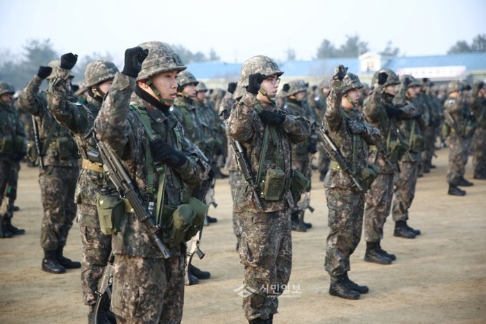 경기 양주시에 위치한 육군 제65보병사단은 4일 부대내 연병장에서 힘찬 새해를 맞이하기 위한 결의대회를 진행했다. 사진은 65사단 군인들이 전투의지 결의를 실시하는 모습.(사진제공=양주시청)
