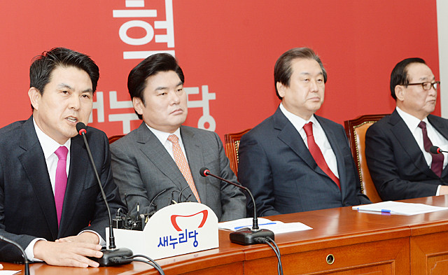 4일 오전 서울 여의도 국회에서 열린 새누리당 2016년 첫 최고위원회의에서 김태호 최고위원이 친박,비박간의 공천에 대해 비판을 하자 김무성 대표와 서청원 최고위원이 심각한 표정을 하고 있다.