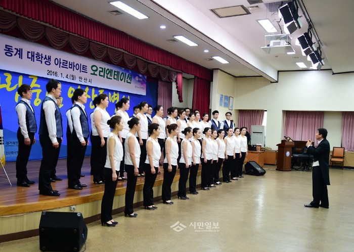 경기 안산시는 지난 4일 시청 대회의실에서 동계 대학생 아르바이트 참여자 285명을 대상으로 오리엔테이션을 개최했다. 사진은 이날 행사에 참여한 시립 합창단이 특별공연을 진행하는 모습.(사진제공=안산시청)